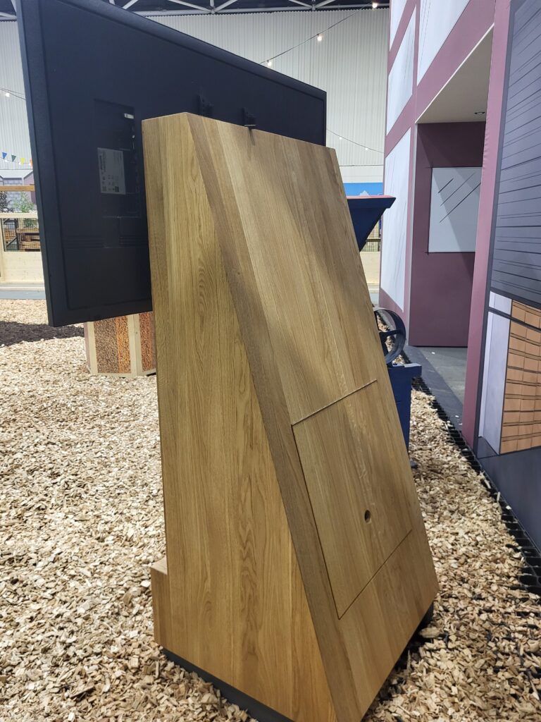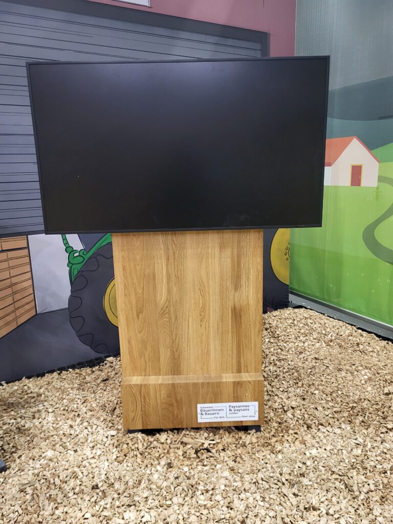 | Beschreibung: | Freistehender TV-Bildschirm mit Touchscreen Funktion und neutralem Sockel aus Holz. Dank seiner Drehfunktion kann der Bildschirm sowohl im Quer- als auch im Hochformat verwendet werden. Auf Wunsch wird der Bildschirm mit Inhalt («Frag Patrik» – Ein Bauer beantwortet die Fragen, welche das Publikum via Touchscreen wählt. Diverse Themen verfügbar) geliefert. Das Zeigen von eigenen Bildern und Videos ist ebenfalls möglich, ggf. bringt der Veranstalter ein USB-Stick mit. |